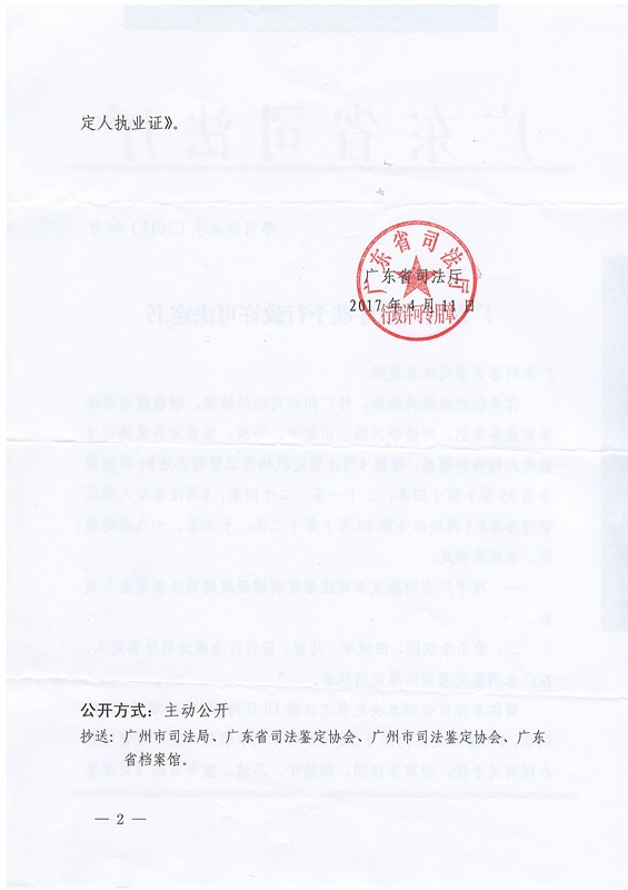 2017年4月11日广东省司法厅 粤司许决字[2017]94号 《广东省司法厅准予行政许可决定书》准予广东明鉴文书司法鉴定所增设痕迹司法鉴定业务类别。 准予李汉国、田建中、马波、张青方为痕迹司法鉴定人,在广东明鉴文书司法鉴定所执业。