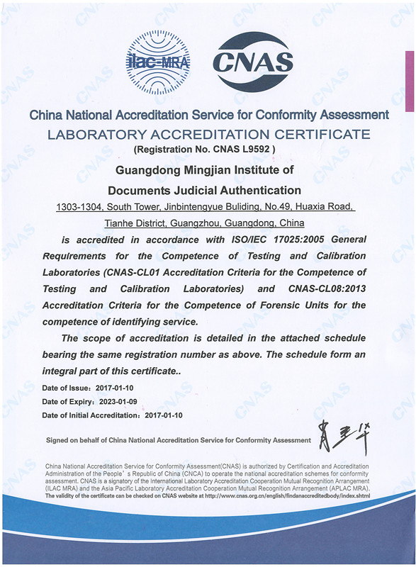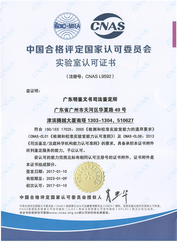 本所符合ISO/IEC 17025:2005《检测和校准实验室能力的通用要求》(CNAS-CL01《检测和校准实验室能力认可准则》)及CNAS-SL08:2013《司法鉴定/法庭科学机构能力认可准则》的要求,2017年01月10日获颁中国合格评定国家认可委员会实验室认可证书。